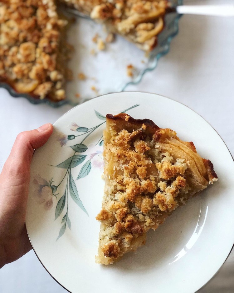 No se que me gusta más de esta tarta de manzana. Si la base de galleta especiada ligeramente, el relleno con manzanas caramelizadas con sabor a canela o las miguitas esparcidas por encima. Si comer una generosa cucharada que incluya las tres capas o bien saborearlas por separado. La cuestión es que está deliciosa y aunque sea una tarta de manzana paleo, no tiene nada que envidiar a cualquiera tradicional.