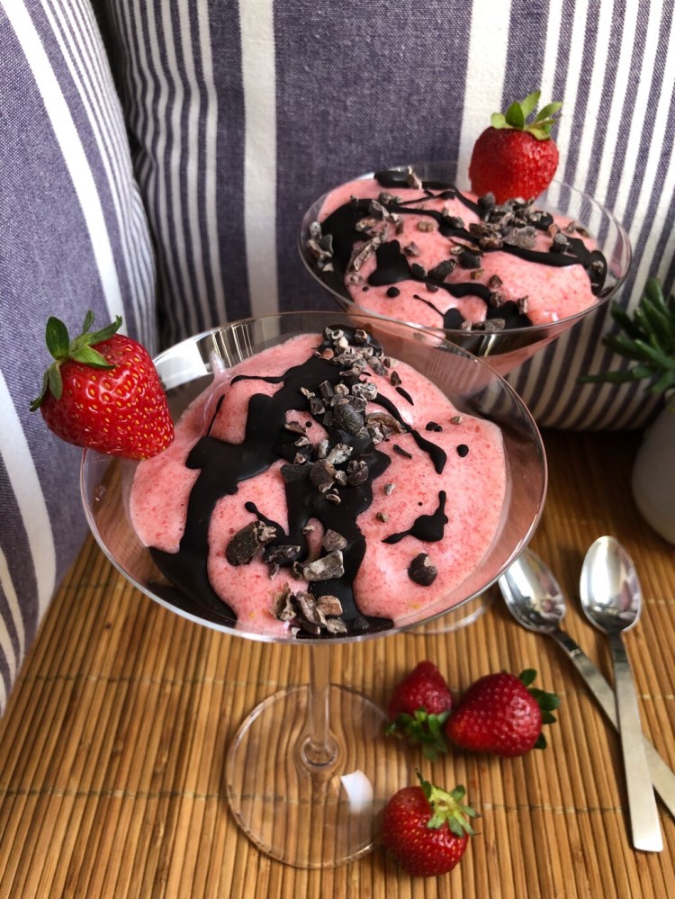 En este caso, el helado escogido ha sido de fresa. Con chocolate derretido por encima, que al entrar en contacto con el helado se solidifica creando una fina y crujiente lámina de chocolate, además de unos nibs de cacao. Pero quien dice fresa, dice mango, piña, higos, solo plátano, aguacate… para gustos los sabores.