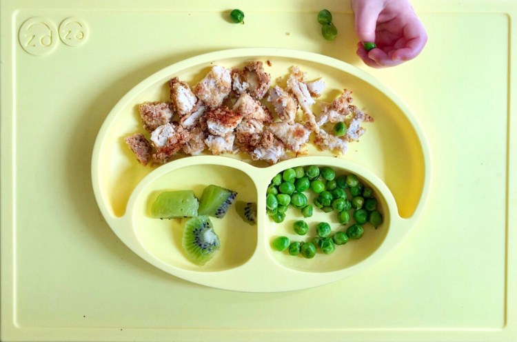 - Pollo ecológico rebozado (en almendra y huevo) con guisantes y kiwi.