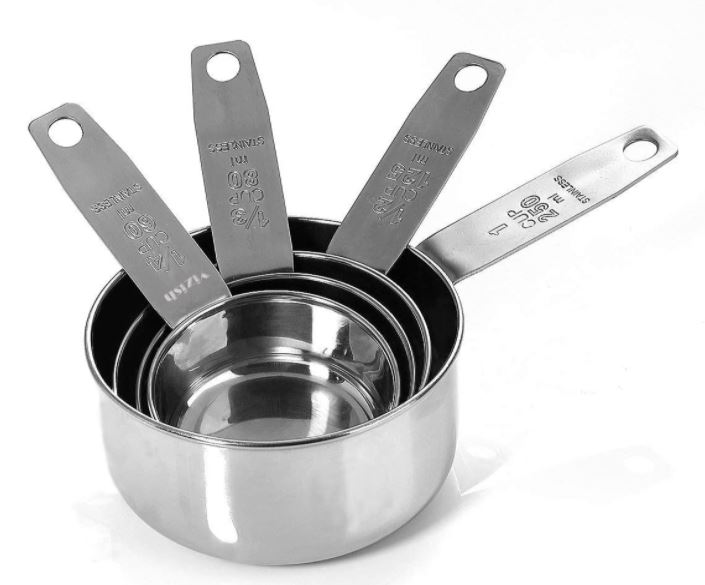 Estos son ejemplos de cucharas y tazas medidoras estándar que podéis encontrar en Amazon, junto a la báscula digital que utilizo.