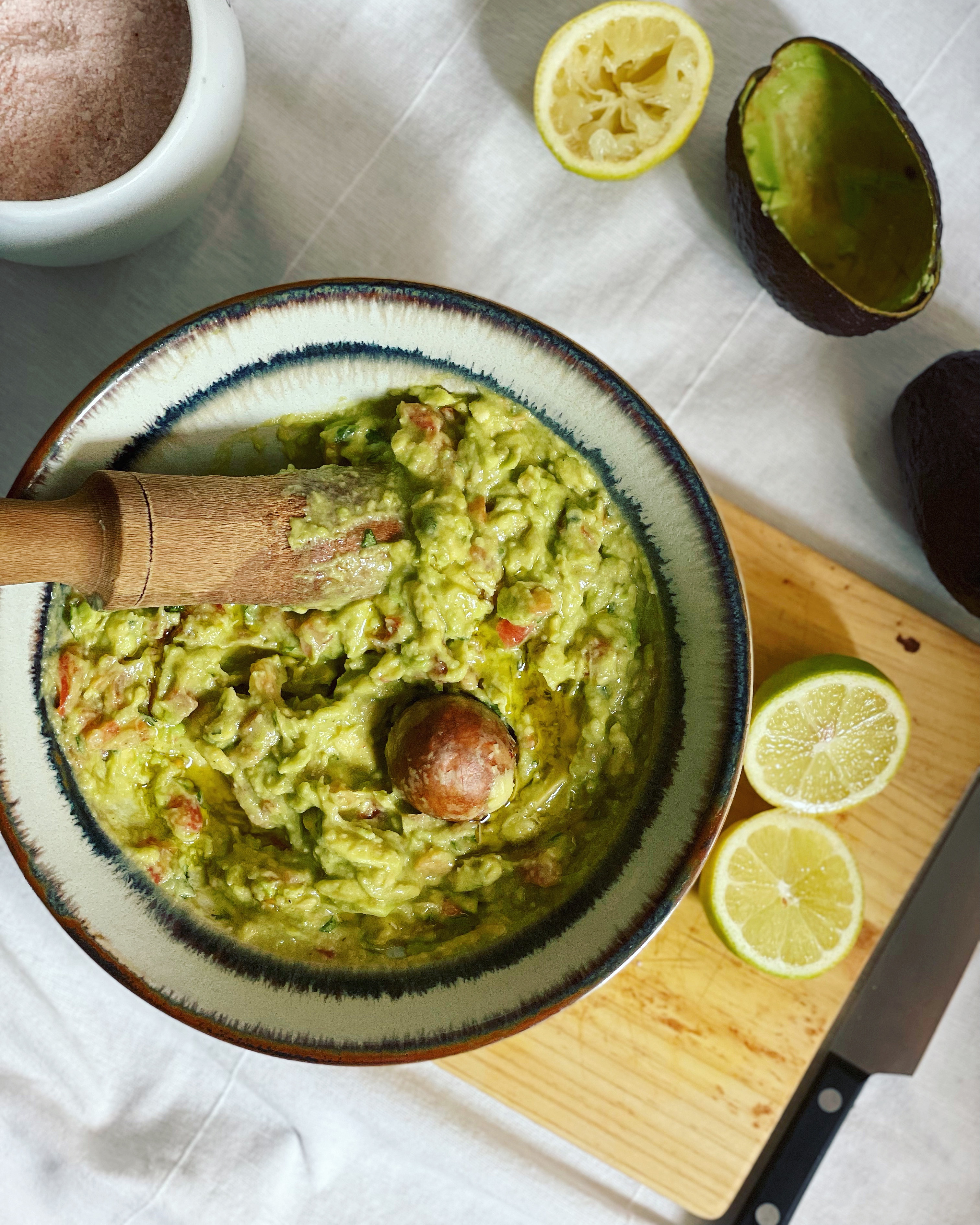 - La clave es ir machacando y removiendo todos los ingredientes con la ayuda de un mortero, el mío es de madera. De esta manera habrá trozos de aguacate chafados pero también enteros, lo que le da una textura ideal. Nunca, repito, nunca trituréis todos los ingredientes en un procesador. No sería un guacamole, sino una mousse, sin textura.