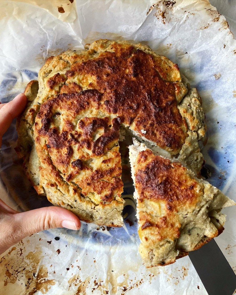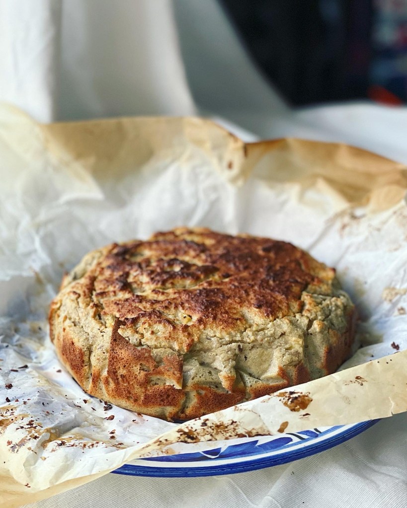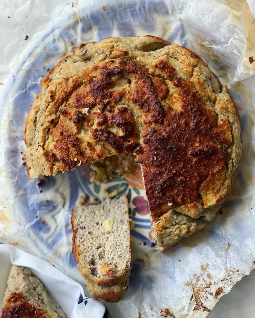 Lo creé bajo petición de mi hija. Ella me iba indicando que quería trocitos de manzana y de nueces, pero, como toda masa sin gluten, tiende a desmoronarse un poquito cuando hay trozos de por medio, sobretodo si queremos que quede esponjoso y no un mazacote. Por eso mi consejo es que distribuyáis bien los trozos de manzana por toda la masa e intentéis haceros con psyllium. Aunque es un ingrediente opcional os lo recomiendo encarecidamente.