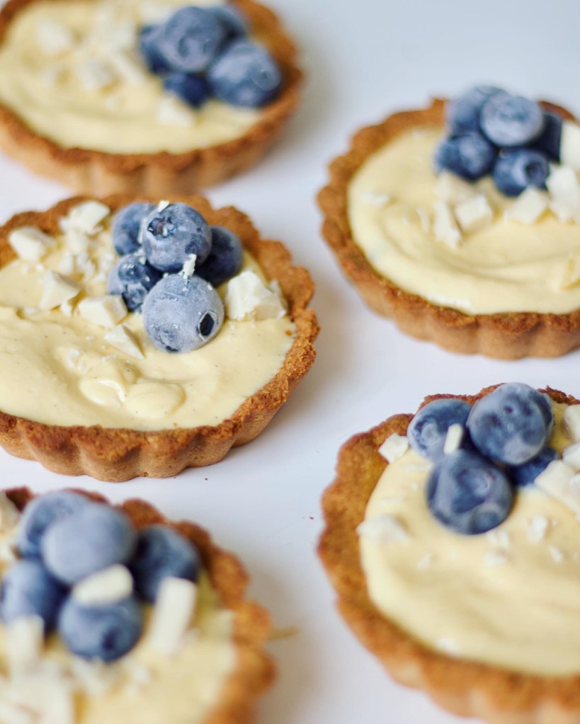 Estas tartaletas de natillas de chocolate blanco son bajas en carbohidratos, aptas para la dieta cetogénica. La base de la tartaleta está hecha con almendra molida y harina de coco. Para el relleno, unas natillas sin lácteos, hechas con bebida de almendra y chocolate blanco, que recomiendo preparéis el día de antes.
