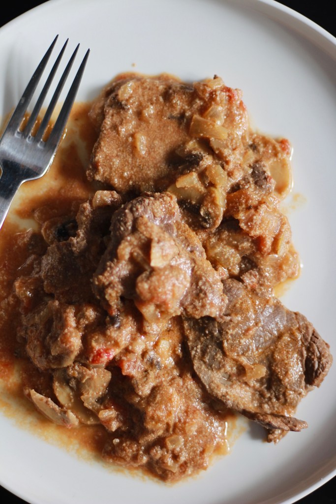 Este plato de carne en salsa es una de las recetas de días festivos con la que mi madre nos mima de vez en cuando. Aunque ella varia entre usar lomo de cerdo o carne de vaca o ternera, yo he aprovechado unas maravillosas milanesas de vaca vieja de Finca Vituron.