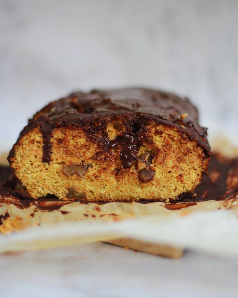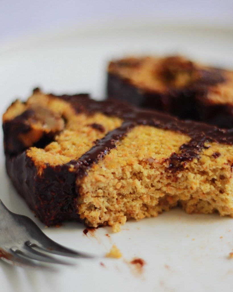 - Derretimos el chocolate junto con la cucharada de aceite de coco y la naranja. Lo vertemos por encima del bizcocho. Podemos meterlo en el congelador para que solidifique más rápidamente.
