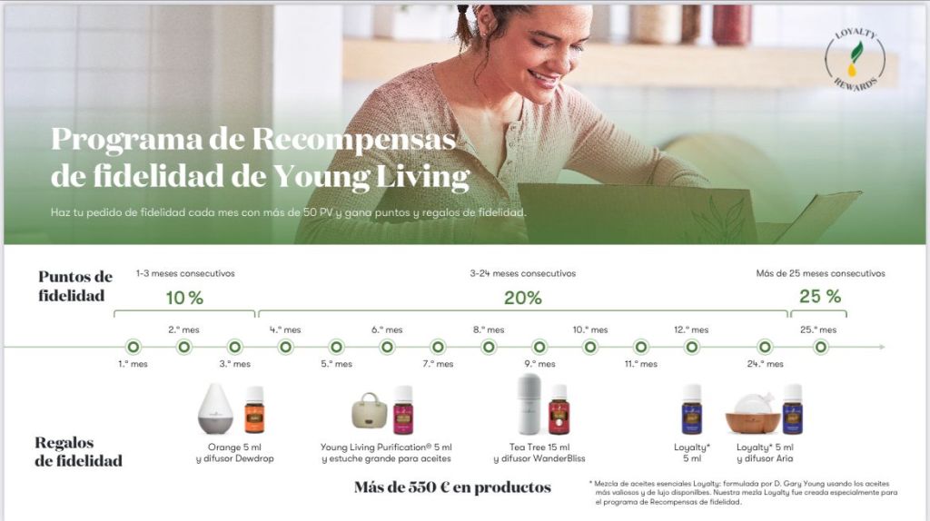 Young Living tiene el llamado programa de Recompensas de Fidelidad. Un programa que recompensa tu fidelidad a Young Living a las personas que hacemos un pedido cada mes en productos para mejorar su salud y calidad de vida. Tan solo tienes que ver a Young Living como tu tienda online de referencia para tus productos de cosmética, higiene personal, suplementación, aceites esenciales, limpieza sin tóxicos… Cada mes cambias los productos de tu cesta de bienestar por los que tú quieras.